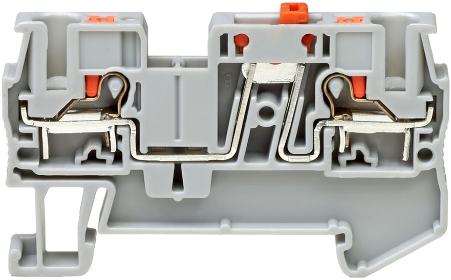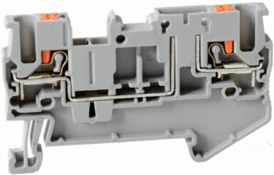 接线端子,额定电压:500V,最大工作电流:20A,接线方式:卡簧连接,连接量:2,压线范围:0.2mm²-4mm²,AWG:24-12,厚度5.2mm,高度35.2mm,颜色:灰色,安装方式:TH35-7.5、TH35-15