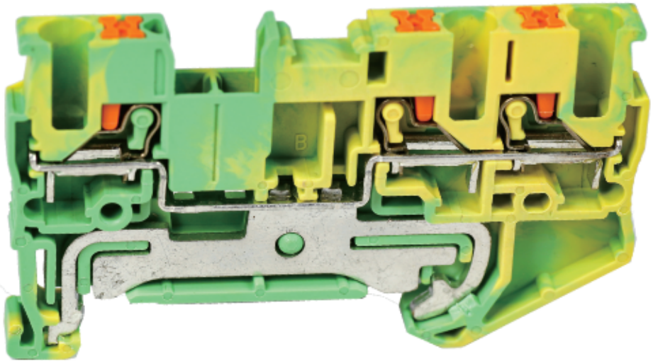 接线端子,接线方式:卡簧连接,连接量:3,压线范围:1.5mm²-16mm²,AWG:16-6,厚度10.2mm,高度49.6mm,颜色:黄绿,安装方式:TH35-7.5、TH35-15