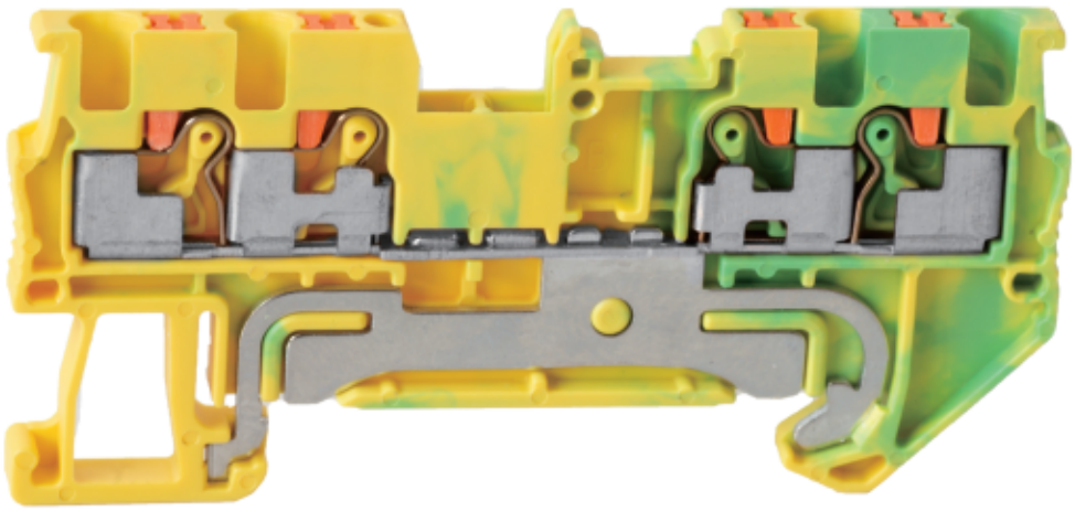 接线端子,接线方式:卡簧连接,连接量:4,压线范围:0.2mm²-4mm²,AWG:14-10,厚度6.2mm,高度35.2mm,颜色:黄绿,安装方式:TH35-7.5、TH35-15