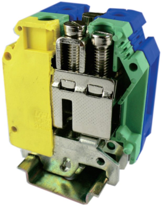 接线端子,接线方式:螺钉连接,连接量:2,压线范围:0.75mm²-50mm²,厚度15mm,高度61mm,颜色:黄绿,安装方式:TH35-7.5、TH35-15、G32-15、G32-18